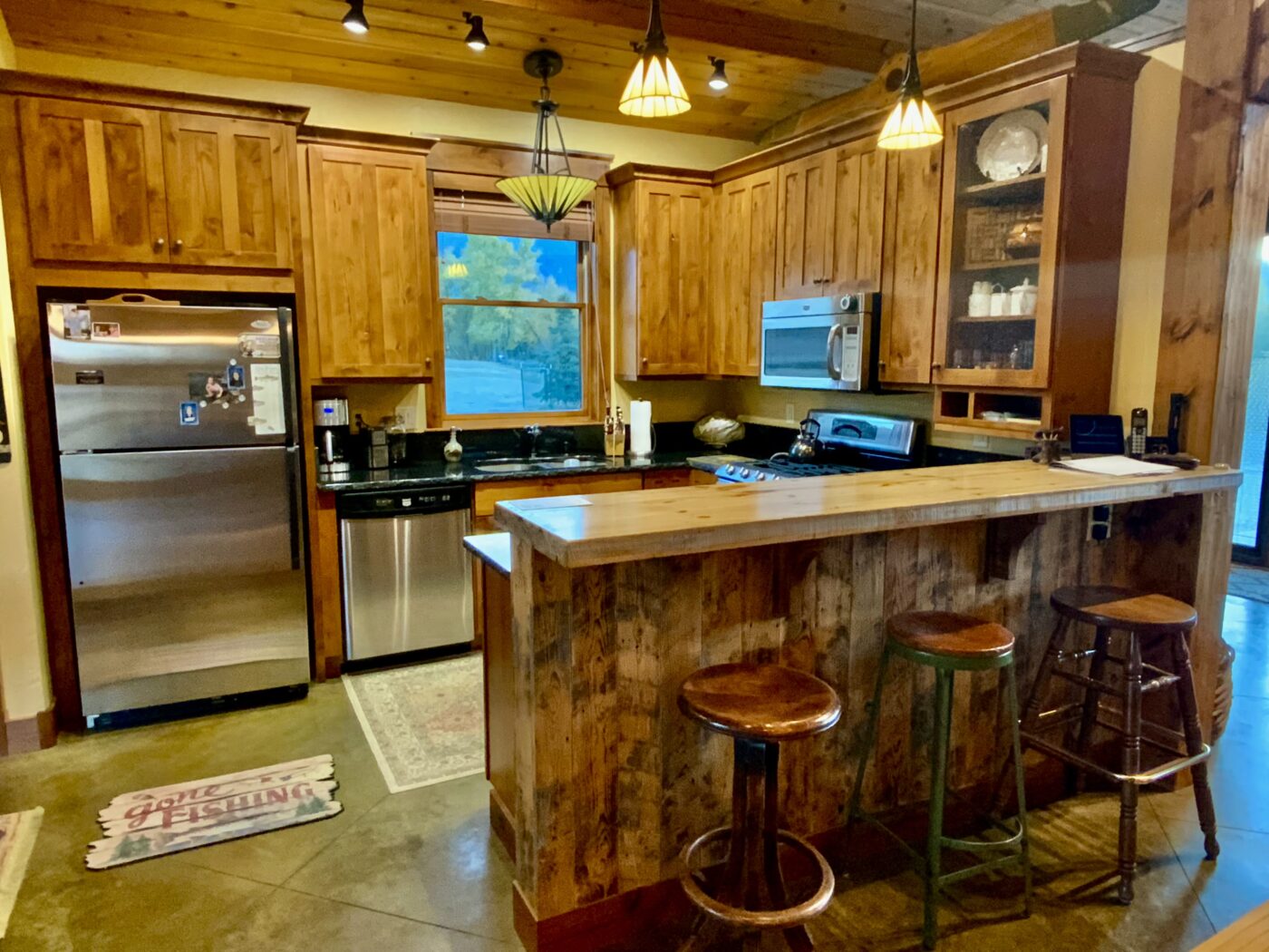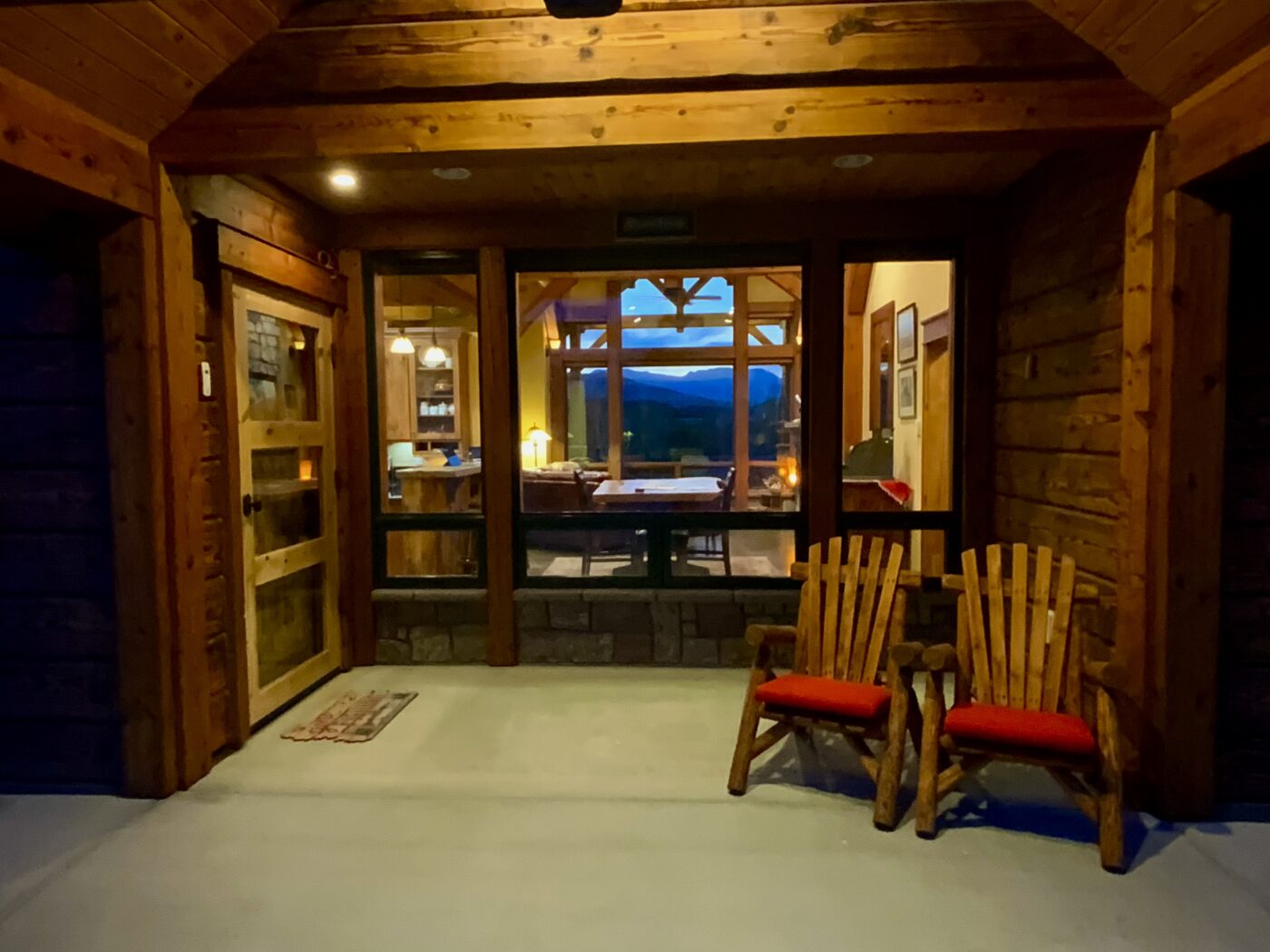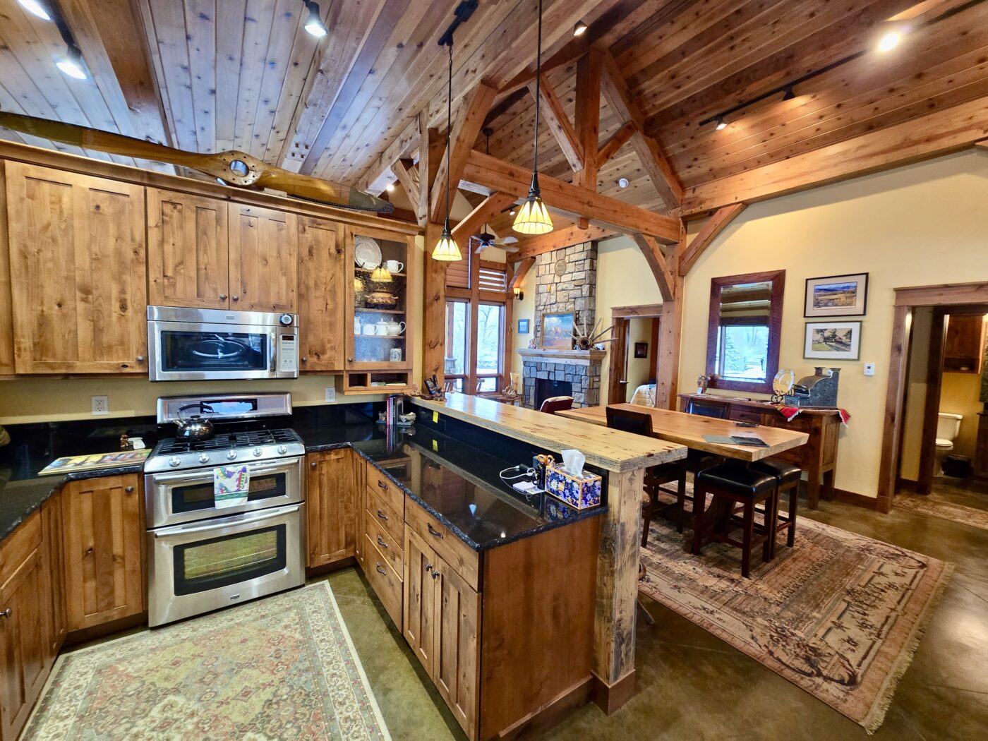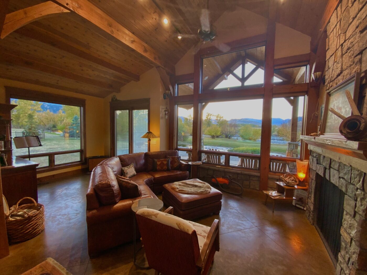 Mountain and river views begin at the front entrance of this luxury River Cabin with large spans of glass both front and back. Amish accent red fir beams throughout gather warmth to this cozy cabin. The custom doors and finish work give this river home its special ambiance.
